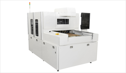 内層板基準マーク位置を画像処理装置で正確に座標測定し、各基板の基準マーク振分け位置に高精度(High Accuracy)X-Y-Y方式(PAT)の調心テーブルにより高精度にアライメントします。アライメントされた各内層板は、溶着方式で仮結合します。