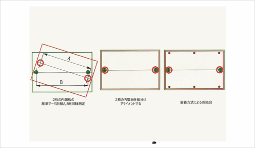 - 上下の内層板を密着した状態で位置決め精度を確認し、設定値以外であれば再アライメントするため層間ズレ不良を作りません。