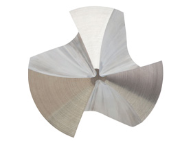 - 3枚刃形状によりバランスがよく、加工中のビビりを低減し2次バリの発生を抑制します。